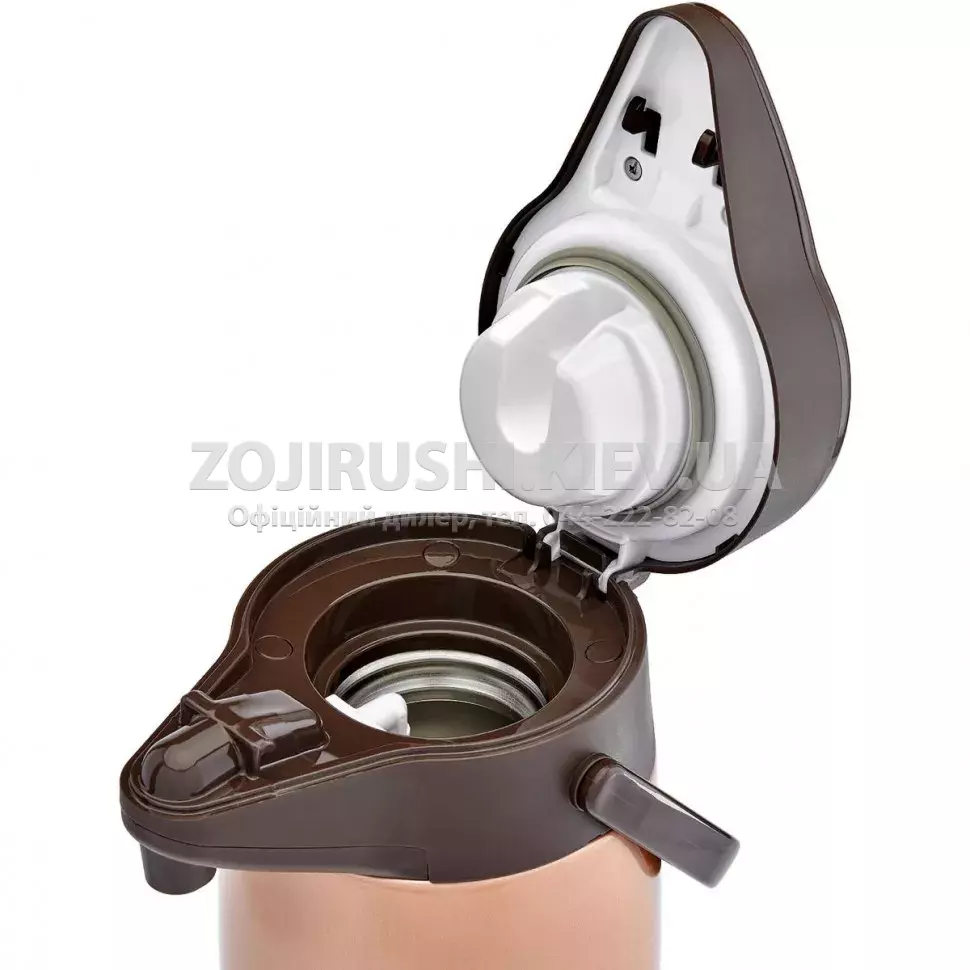 Верхня відкидна кришка термоса оснащена клавішею з помпою, що дозволяє наливати напій без відкривання.
